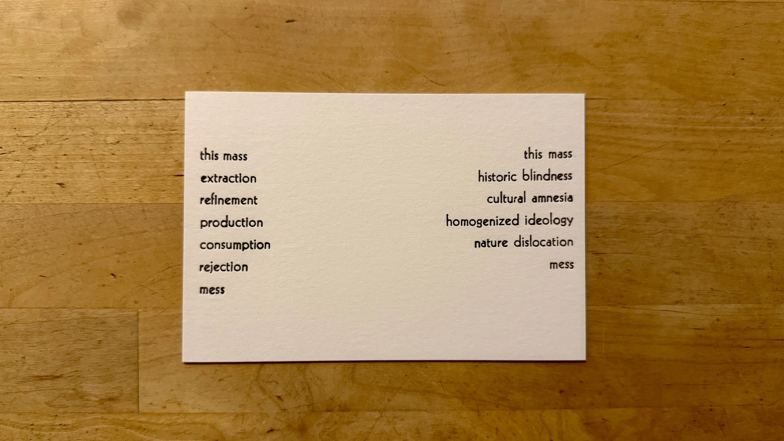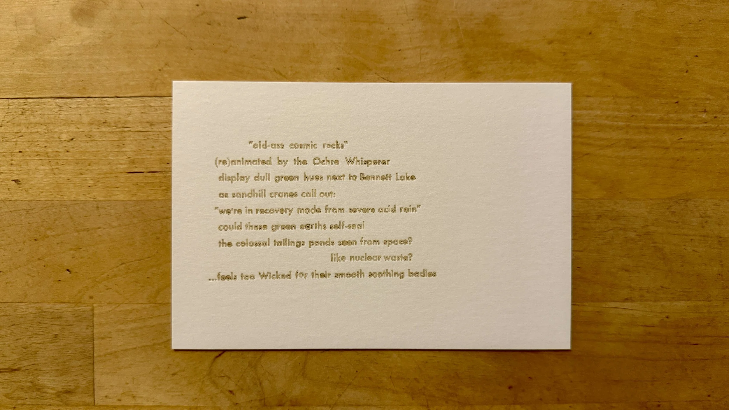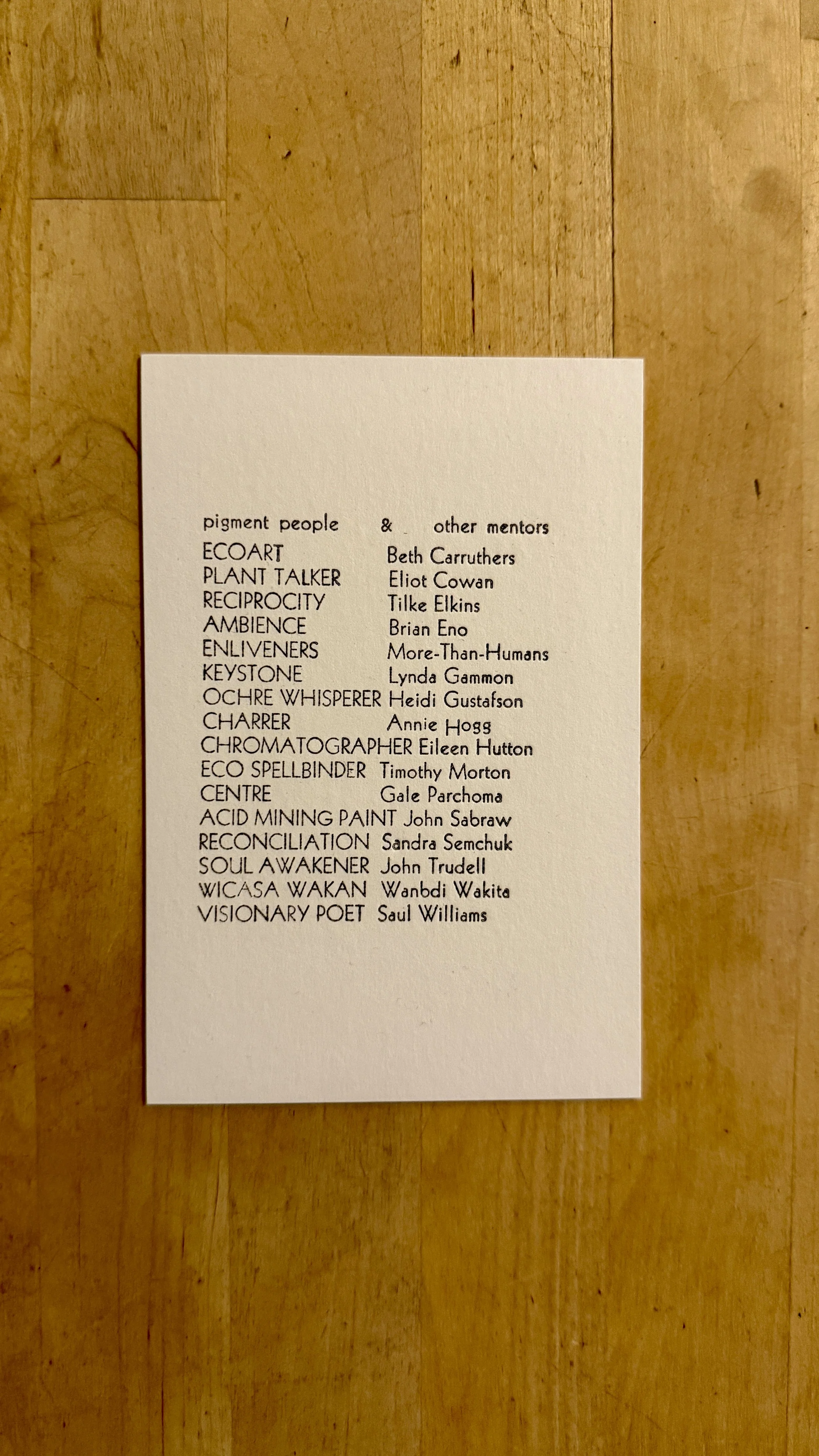 In late 2023, Lynda Gammon, a long-time mentor, reviewed one of our research proposals that contemplated the climate crisis through sound art and material practices. Gammon, the head of flask publishing, responded with an offer to develop and publish an ee portal art book. Since that time ee portal has been working toward the realization of sounds are pigments are places, an interdisciplinary meditation on our collective ecological entanglements. With grants ee portal garnered from the Ontario Arts Council and Canada Council for the Arts, together with the support of flask, the art book series is set to be published and disseminated in 2026.