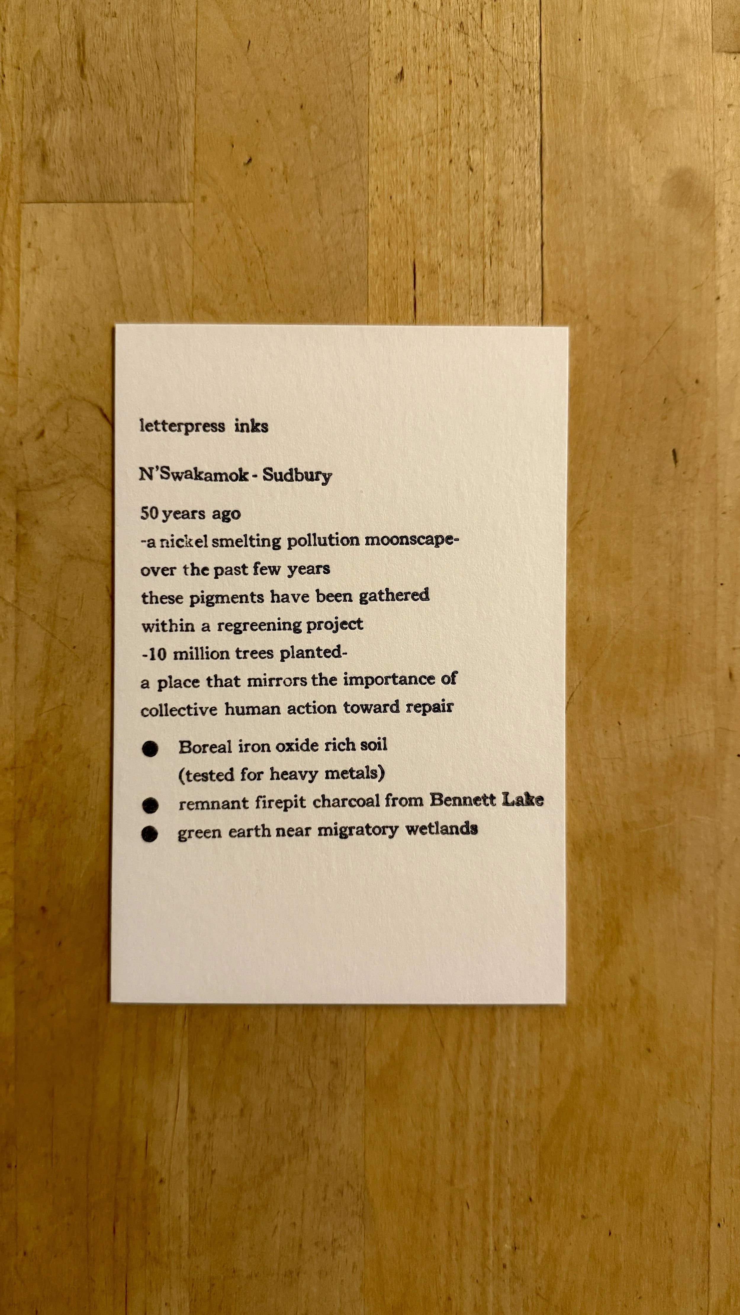 This project embraces a deep engagement with the land through colour, sounds and words transferred to 1000 pages and extended to online and exhibition encounters. sounds are pigments are places describes the trajectory of our collaboration as ee portal, which has always been a project of joint authorship that critically questions the capitalist and colonial status quo, and engages in transdisciplinary actions. This cumulative research in sound art, pigments and ecomaterial processes will form a series of 20 art books of 50 pages each. Within these 1000 pages, we have experimented with letterpress printing processes, at the University of Victoria’s Farallon Book Arts Lab. Each book is its own art piece, uniquely made with handcrafted inks from the boreal forest.