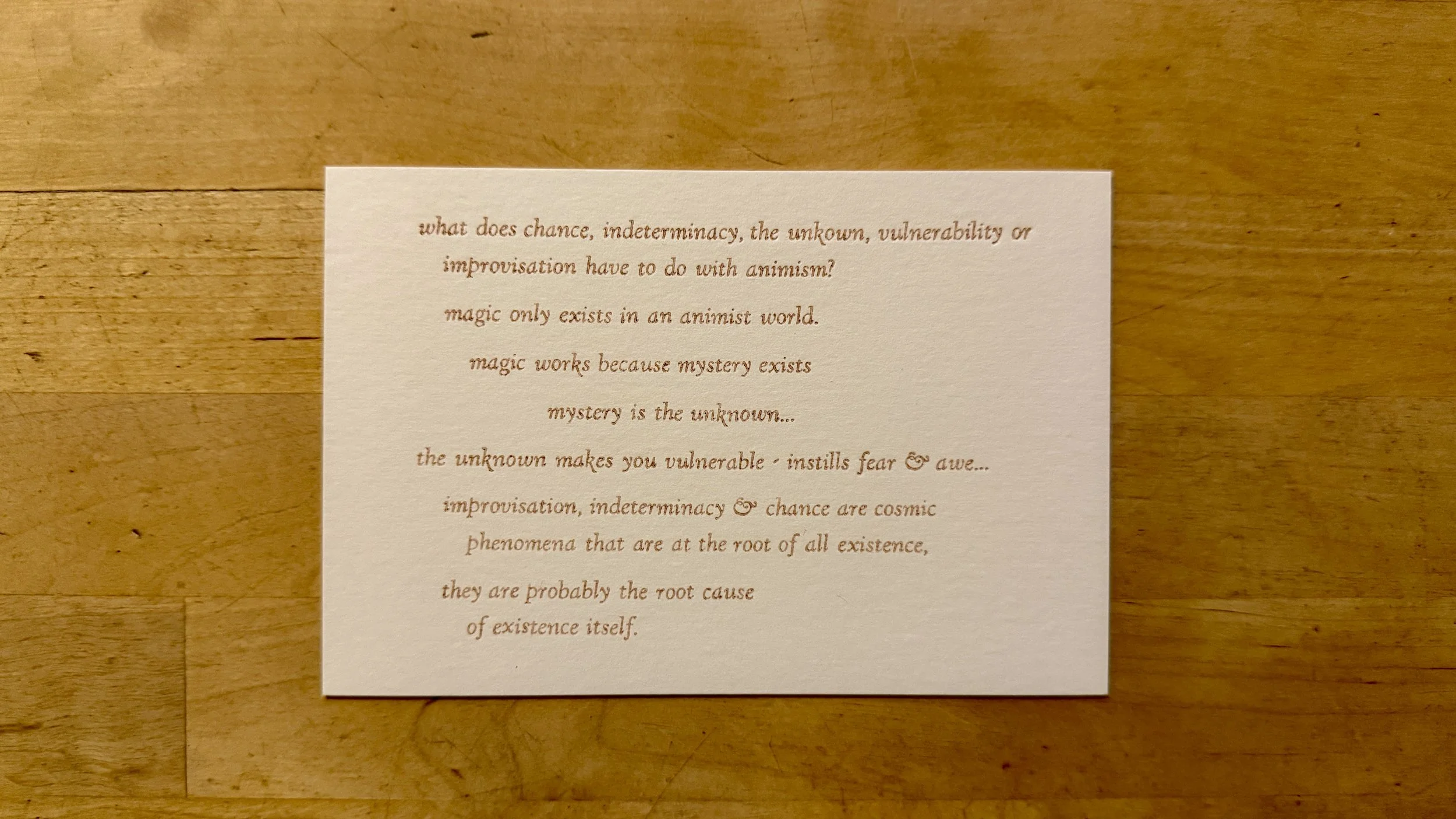 sounds are pigments are places is not only an ethic it is a magical statement. At its essence, it conveys that everything is interchangeable, that everything is fluid. Our animist view of the world shows us that all things, animate and inanimate, not only exist in equal ways, but each entity is dependent on one another for their very existence. We are attempting to go even deeper into this process to be able to express how sounds are actually also pigments, and how pigments are actually places, and so forth.